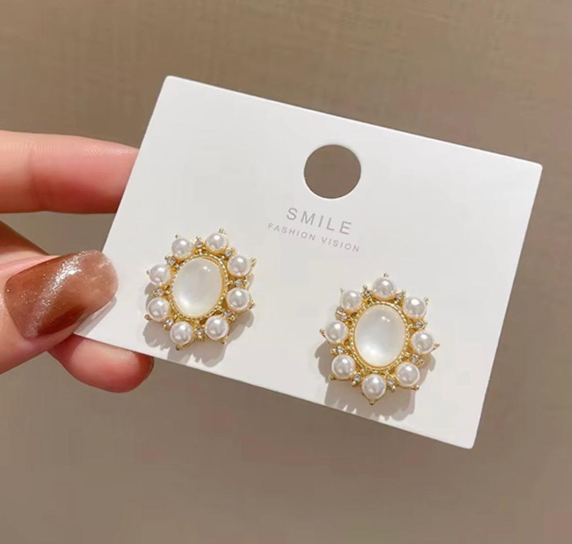Central oval stone by small pearls stud
